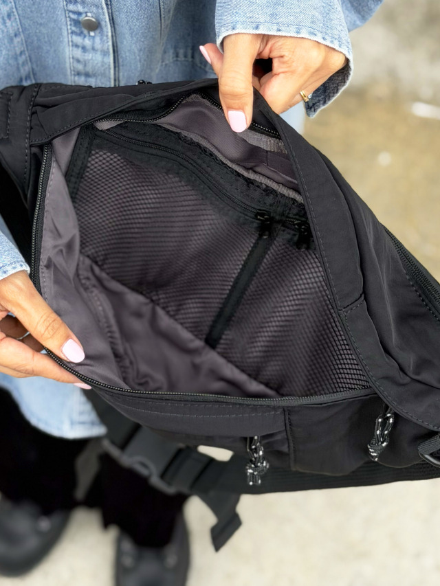 内側にはファスナー付きメッシュポケットがふたつあります。