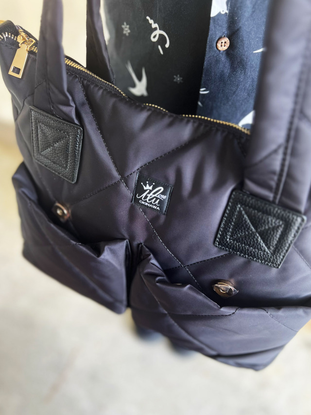 軽くて柔らかいナイロンを使用した。中綿入りキルティングトート。