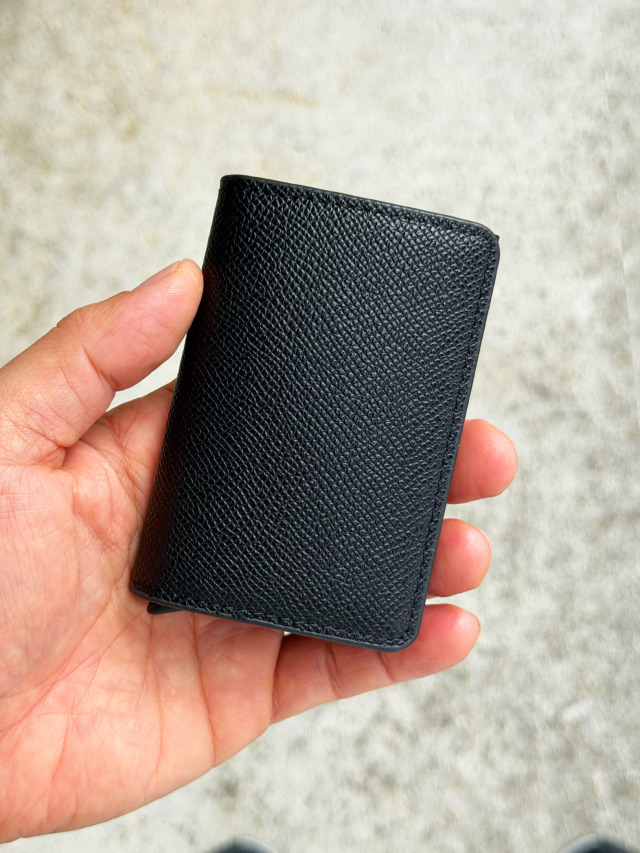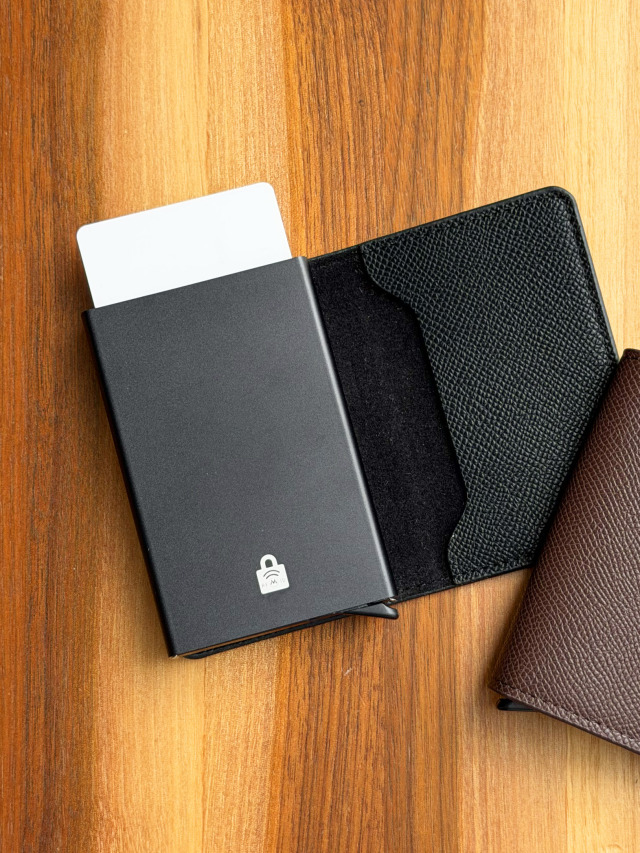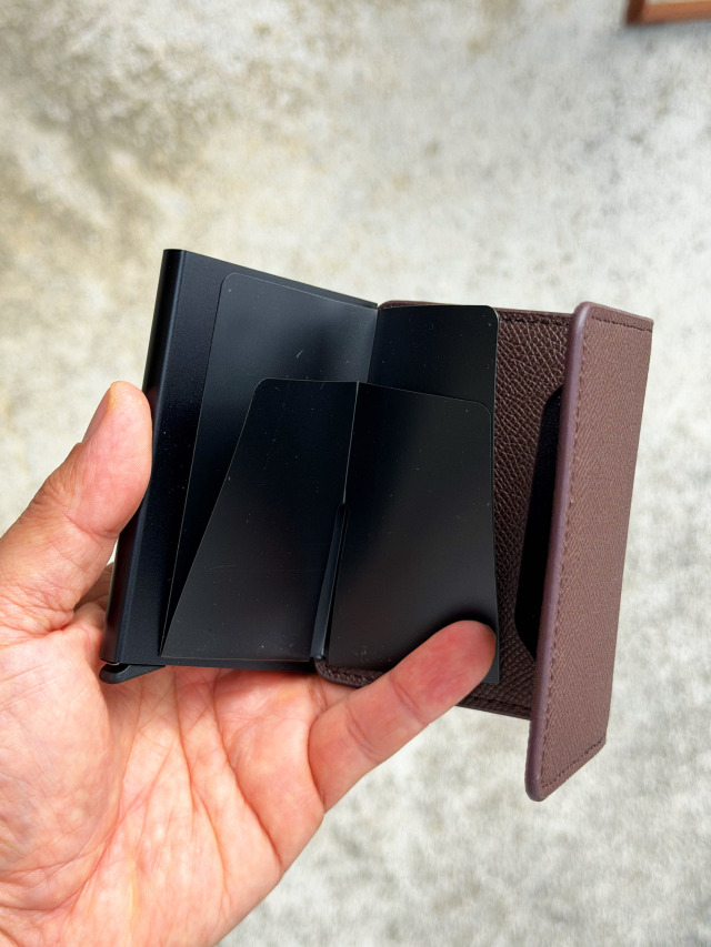 下部のレバーをスライドさせるとカードが飛び出すスマートなカードケース
