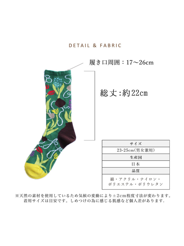 植物や花がいきいきと描かれ、日々の足元に彩りを添える靴下